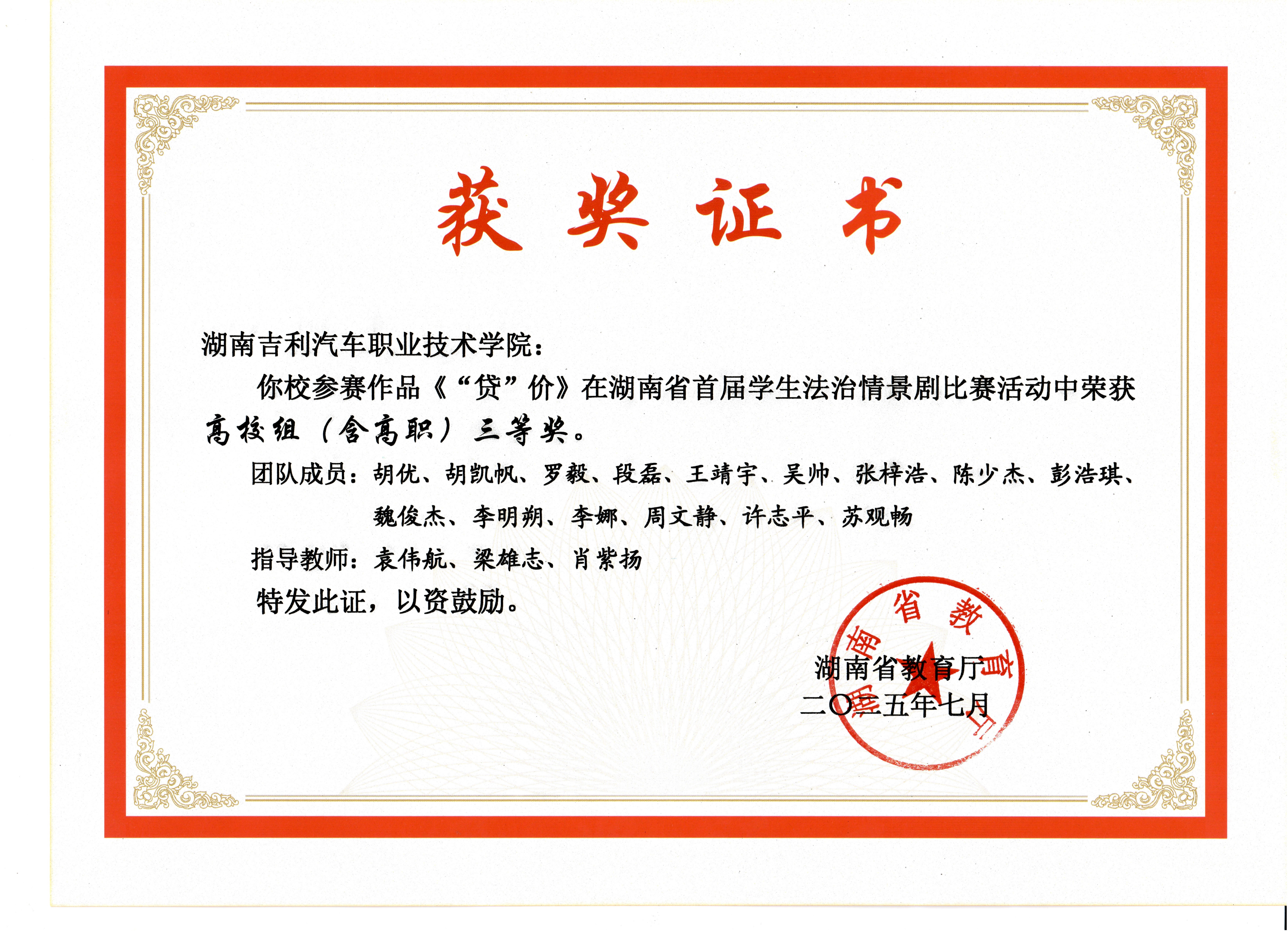 2025年7月湖南省首届学生法制情景剧比赛高校组(含高职)三等奖