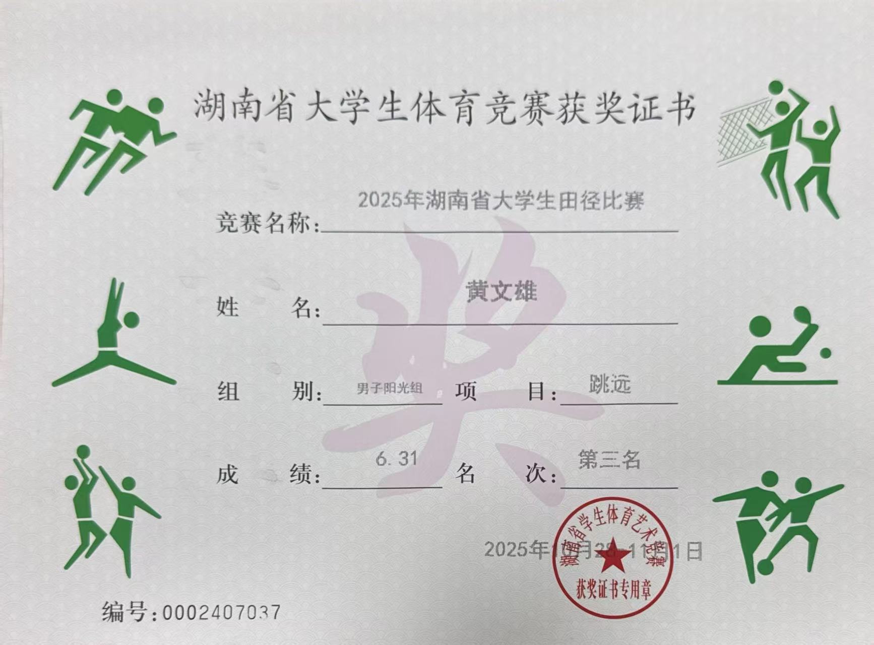 2025年湖南省大学生田径比赛跳远第三名